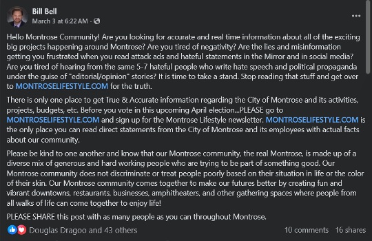 In a Facebook post on Tuesday, March 3, 2026, the City of Montrose’s long of tooth City Manager, Bill Bell, crowned himself as the City government’s “Arbiter of Truth.” This position, for the sake of simplicity, is more commonly known as the “Propaganda Minister” in most totalitarian regimes and in this case, for the City of Montrose. That’s gotta be worth another $100 grand in salary on top of his quarter million-dollar annual paycheck and with all of the freebies he gets at taxpayer expense thrown in for good measure!