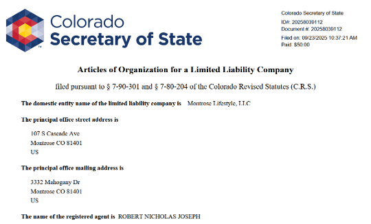 The partnership of Bell and Joseph formally registered their business on September 23, 2025, with the Colorado Secretary of State after months of Mr. Joseph as the sole independent contractor. (See below)